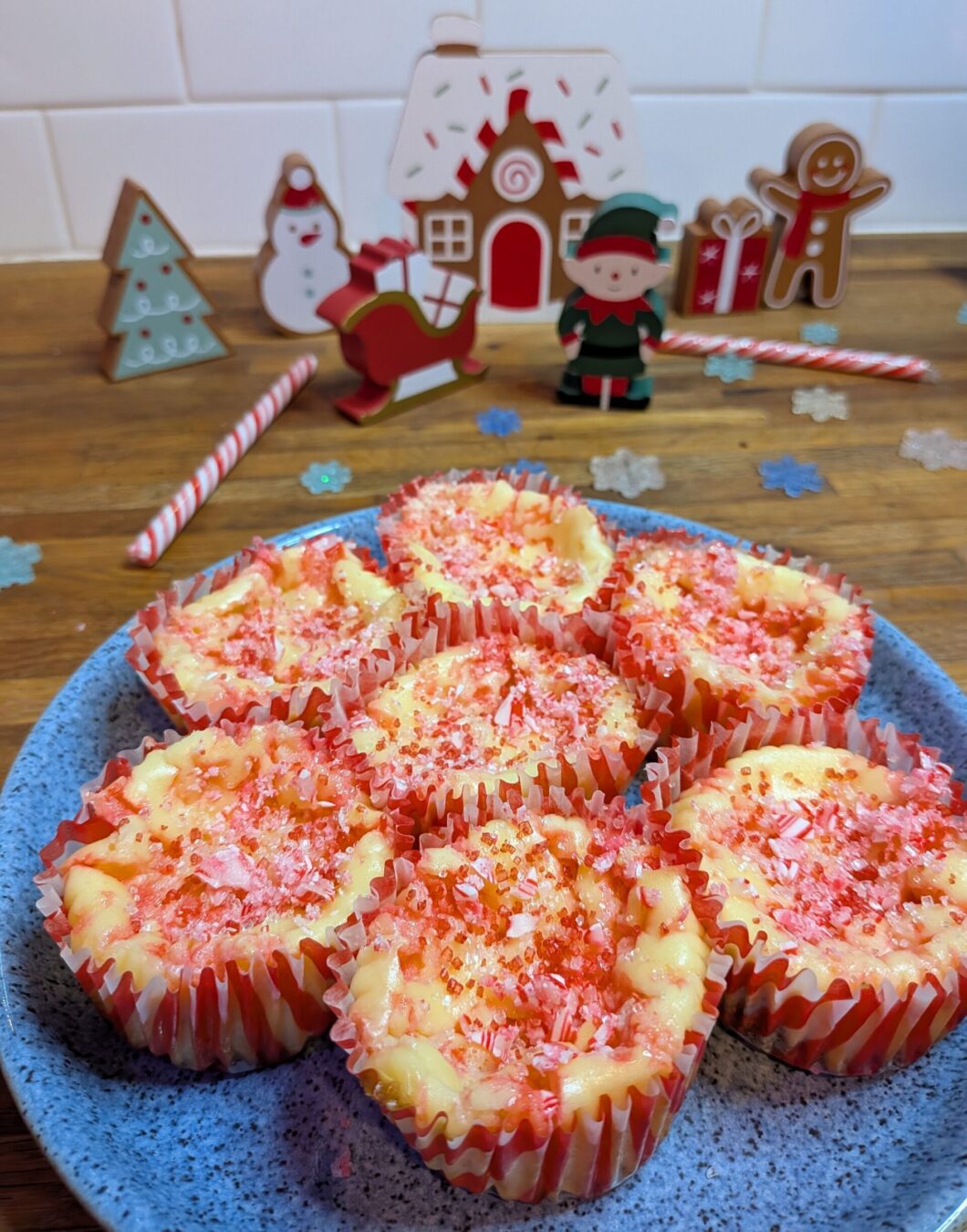 11. Optional; help sprinkle tops of cheesecakes with crushed candy canes and sprinkles.