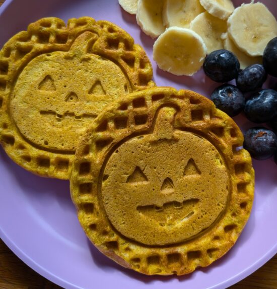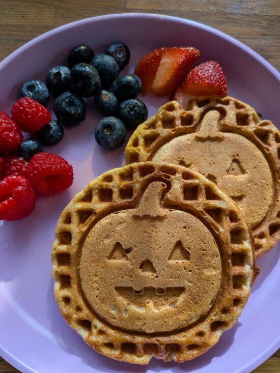 These waffles are the perfect fall inspired waffles and my toddlers LOVE them. Additionally, using fun shaped waffle plates makes these waffles even more fun…