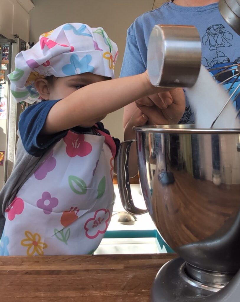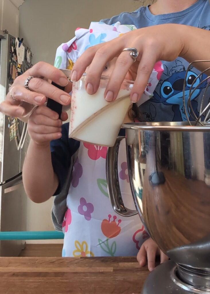 4. Pour pre-measured ingredients into mixing bowl. You can assist with hand over hand to ensure it all gets in the bowl.