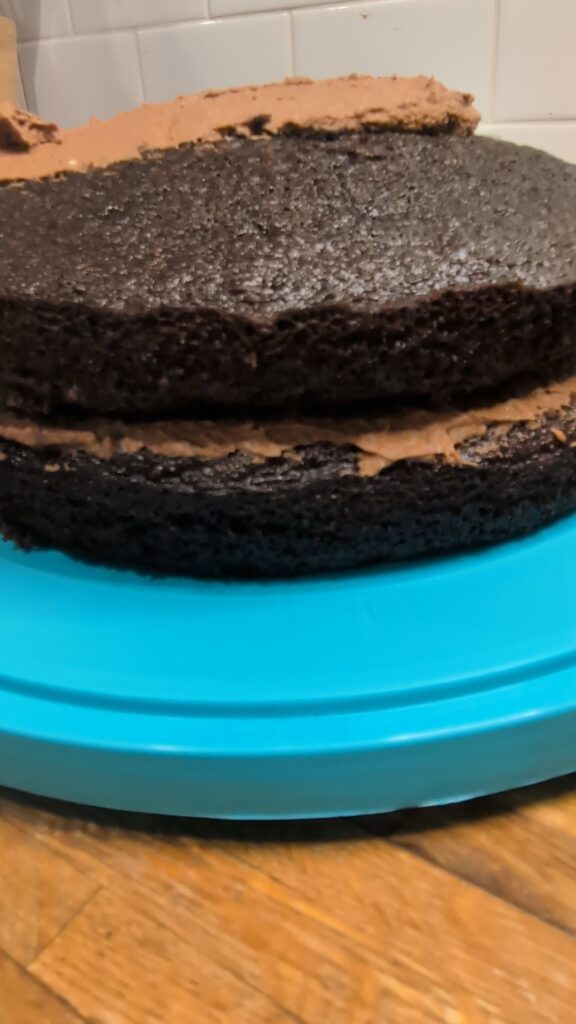 - Place one cake on cake stand, storage container, or serving plate.