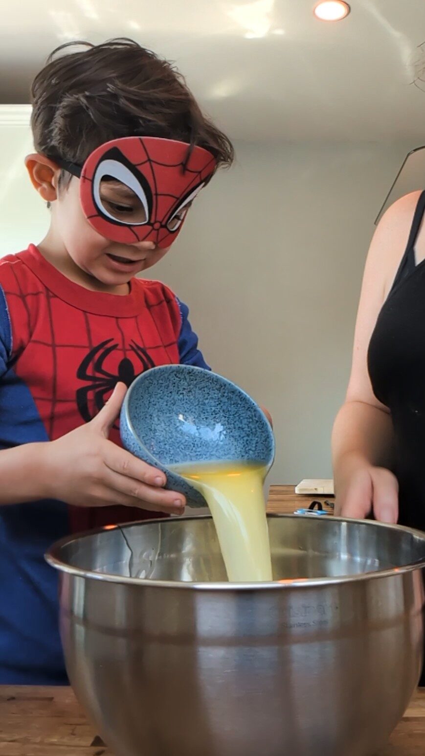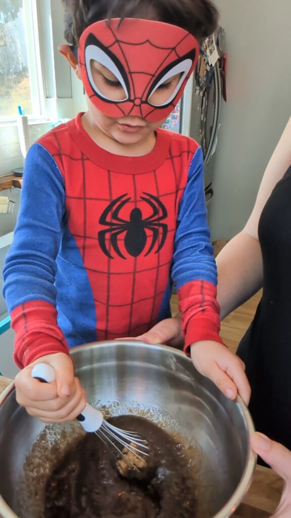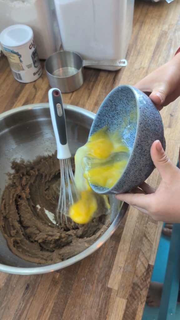 4. Crack eggs into separate bowl. Add to mixing bowl. Whisk to combine with help as needed.