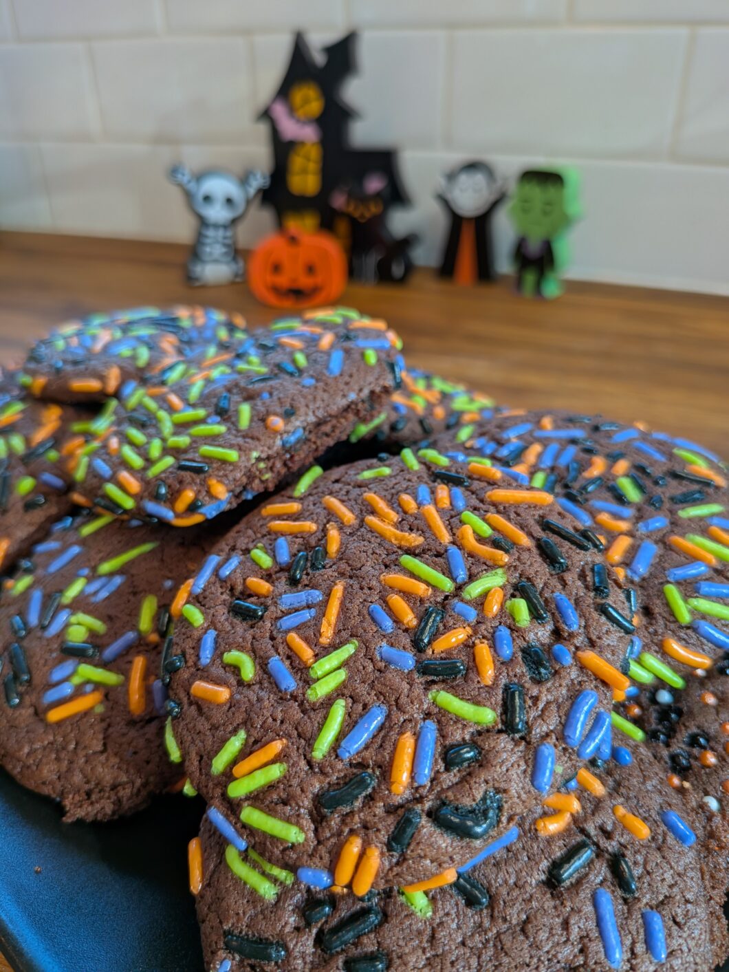 - Since these are sugar cookies, the cookie dough balls are sticky in order to be rolled in sugar which helps the sprinkles stick. You can either roll the entire ball in Halloween sprinkles or dip the bottom half in sugar and top half in sprinkles.