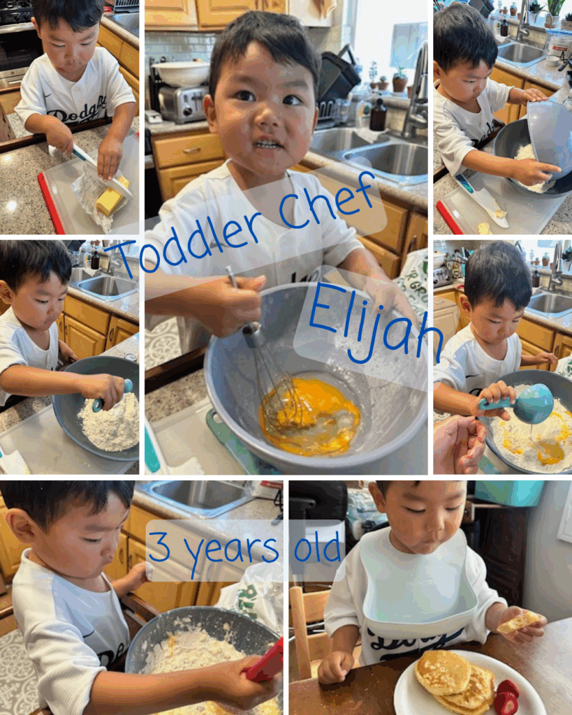 Update: Chef Elijah updated us that he has been practicing his pro level toddler chef skills, including cutting with a knife by himself and using a whisk to combine ingredients. He has also made the Island Style Hot Cakes a few times now!