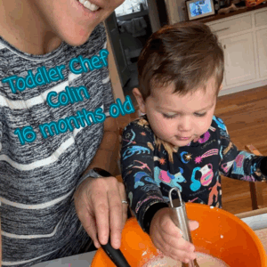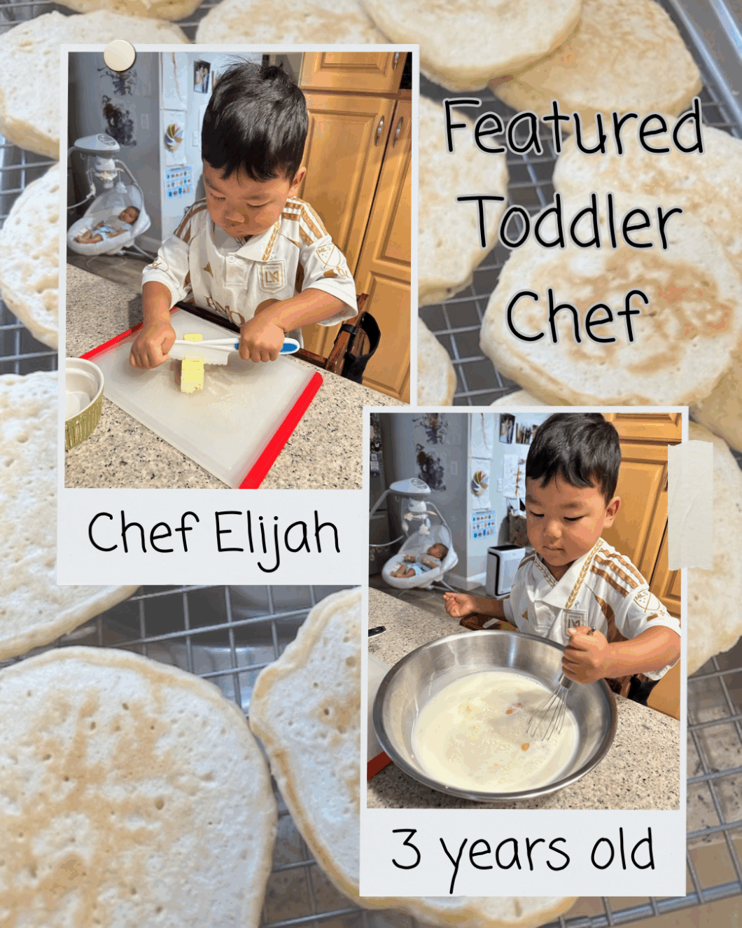 Update: Chef Elijah updated us that he has been practicing his pro level toddler chef skills, including cutting with a knife by himself and using a whisk to combine ingredients. He has also made the Island Style Hot Cakes a few times now!