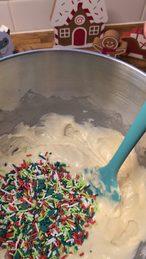 7. Add pre-measured ingredients to mixing bowl. Help to fold sprinkles in.