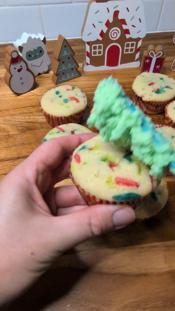- Using an icing spatula or piping bag with tip, frost each cupcake and add additional Christmas sprinkles.