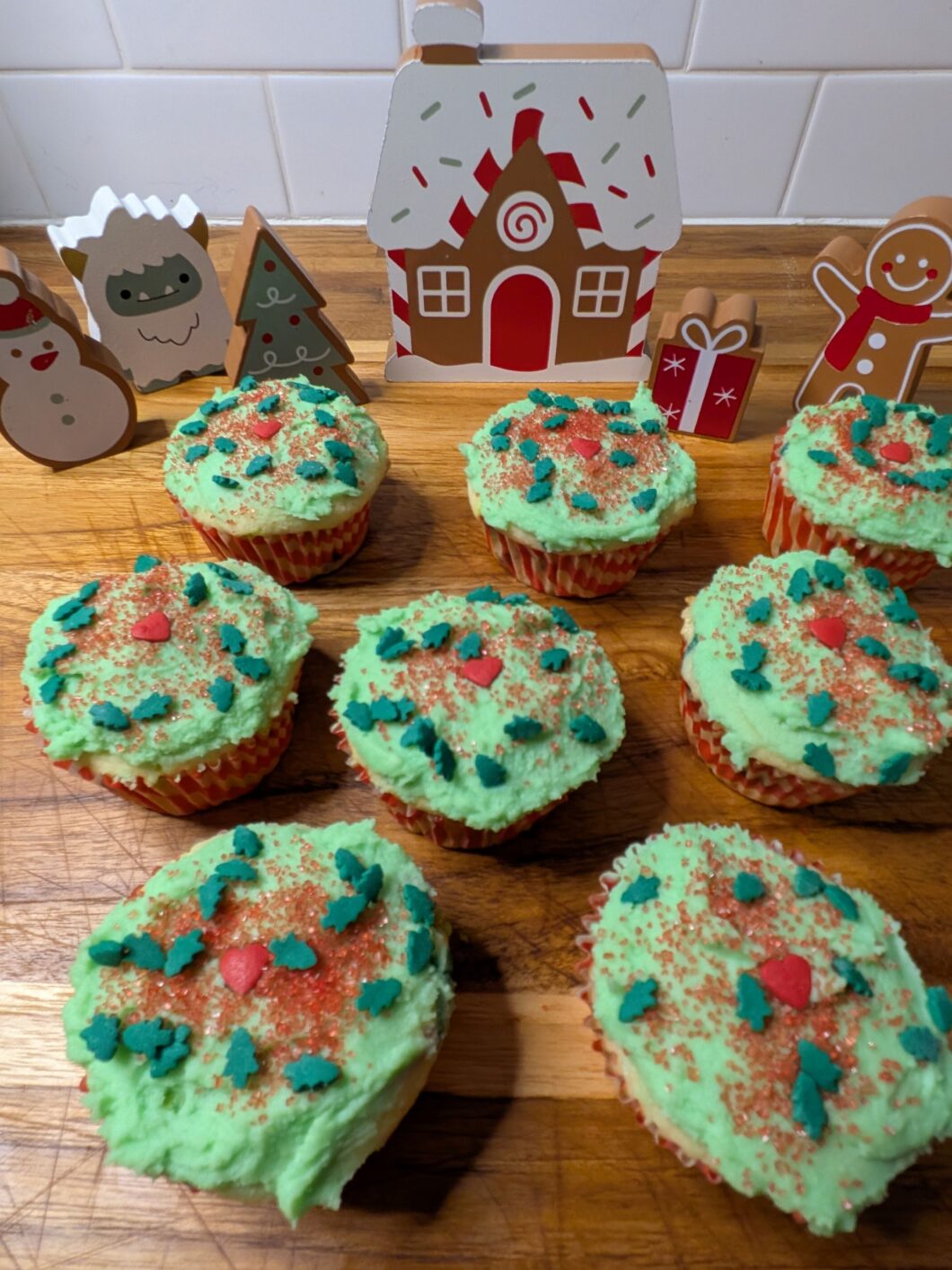 - Using an icing spatula or piping bag with tip, frost each cupcake and add additional Christmas sprinkles.