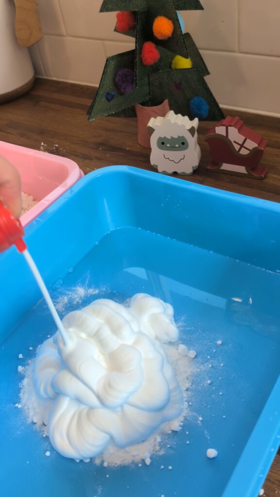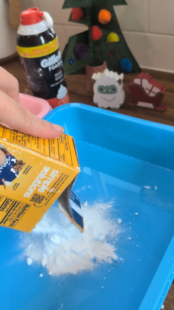 - In a plastic container/tray, add box of baking soda then slowly add shaving cream until you reach desired snow consistency. (I used a little over 1/2 a can of shaving cream)