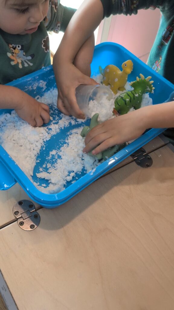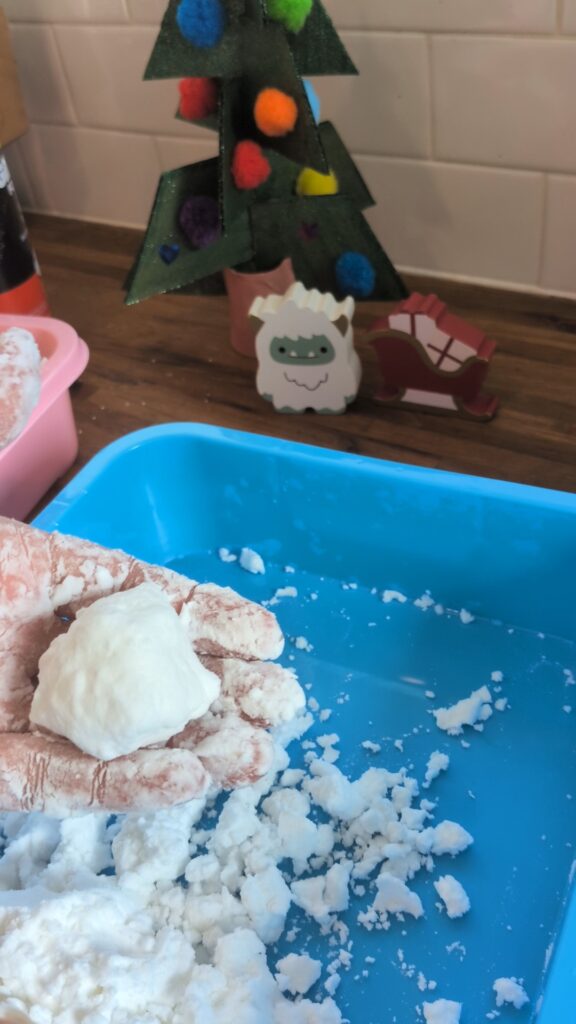 My SoCal toddlers LOVED this activity – they played with the “snow” for a solid 40 minutes the first day and thankfully it keeps well as my toddlers wanted to play with it multiple days in a row.