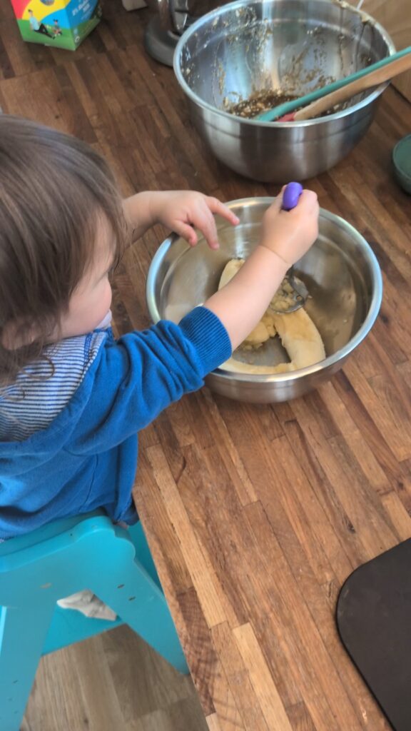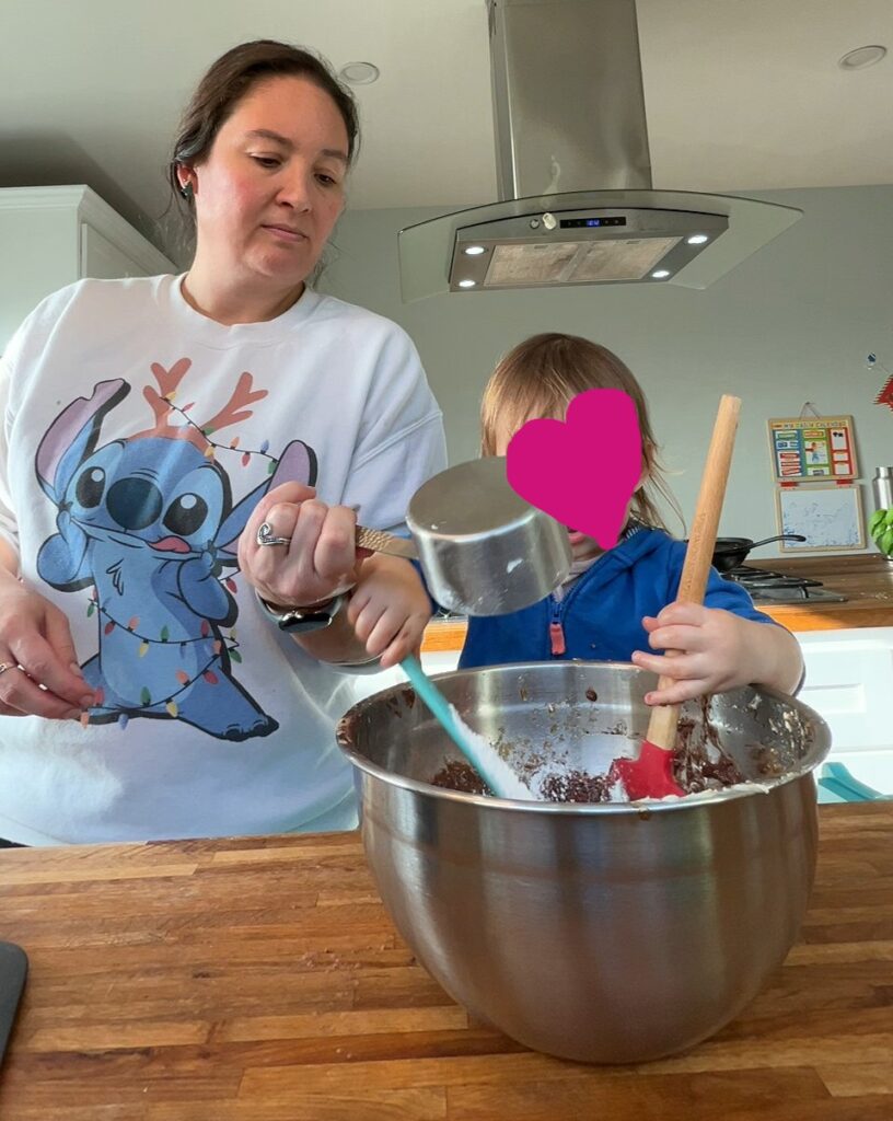 6. Pour in pre-measured ingredients. Help to fully mix into batter with help as needed.