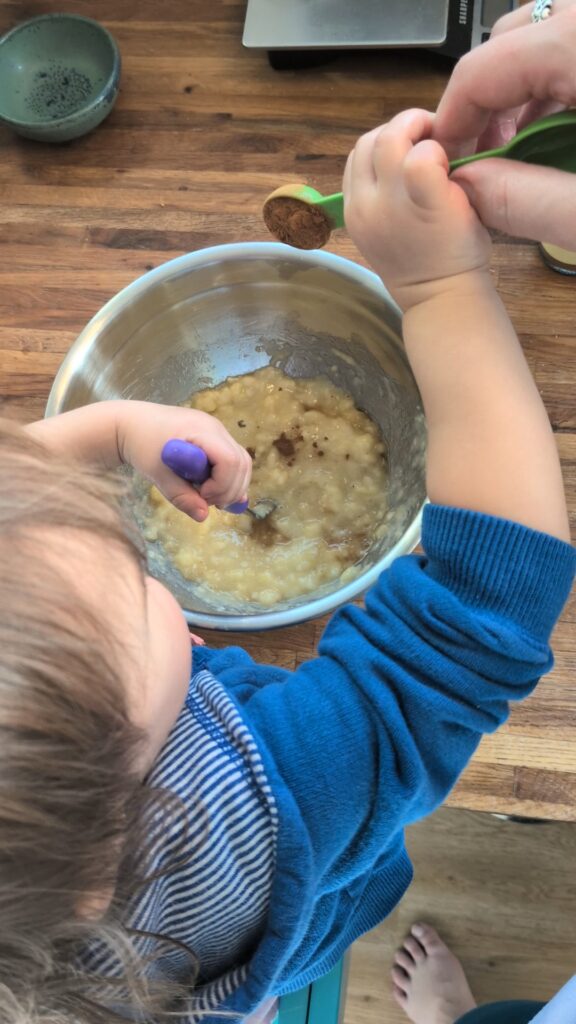 5. Pour in pre-measured ingredients. Help to fully mix into batter with help as needed.