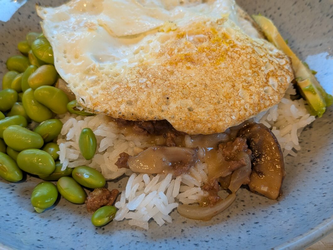 - Serve over white rice and topped with an egg (cooked to preference**).