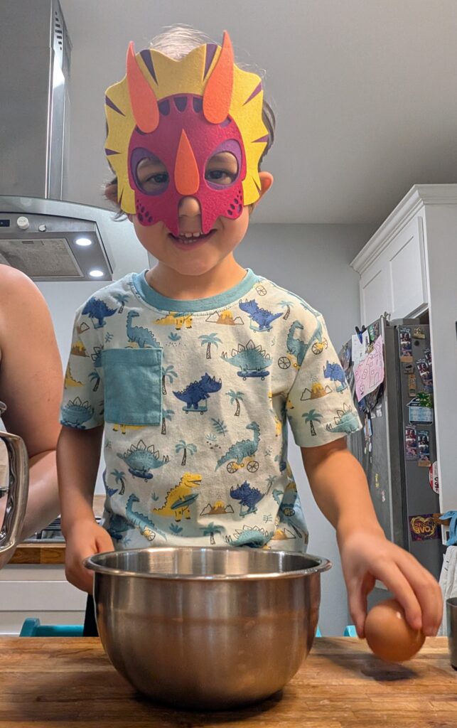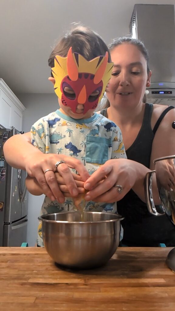 4. Crack eggs into separate bowl, then pour into mixing bowl. Help measure and add remaining ingredients to bowl.
