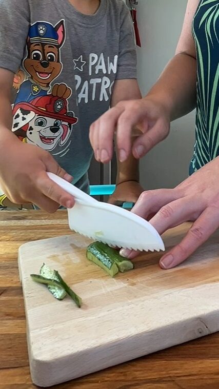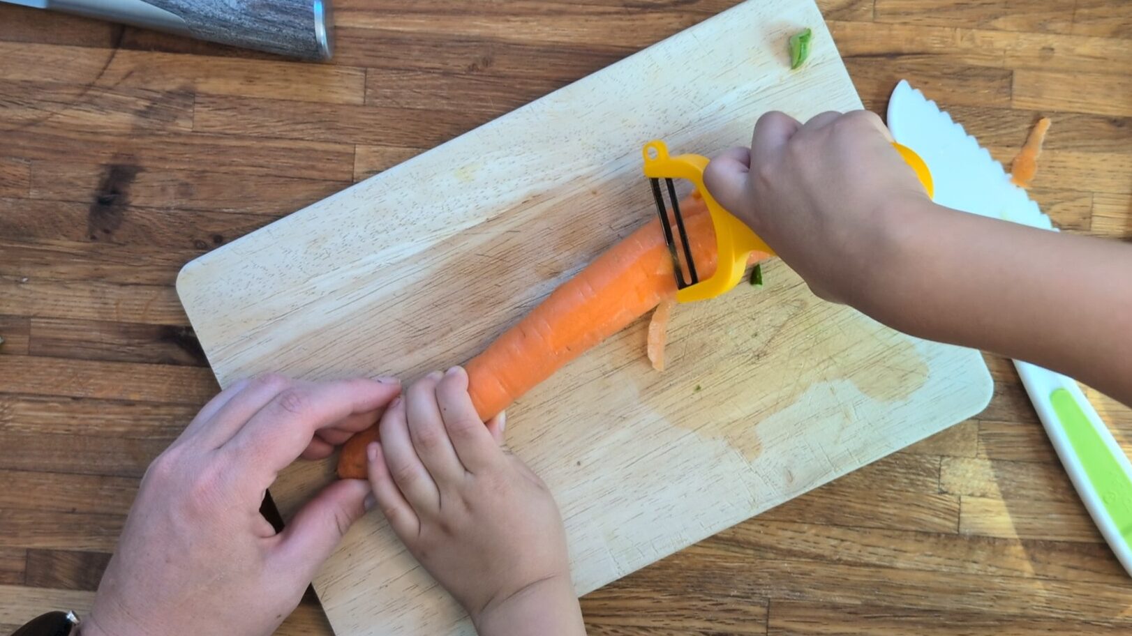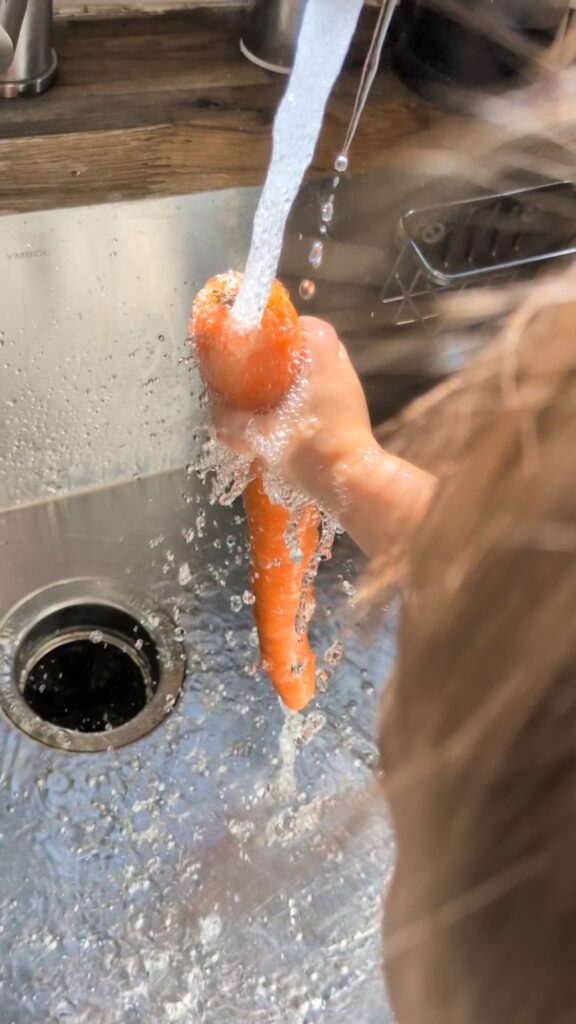 3. Wash carrots and cucumbers. Help cut cucumbers, and help peel and cut or grate carrots.