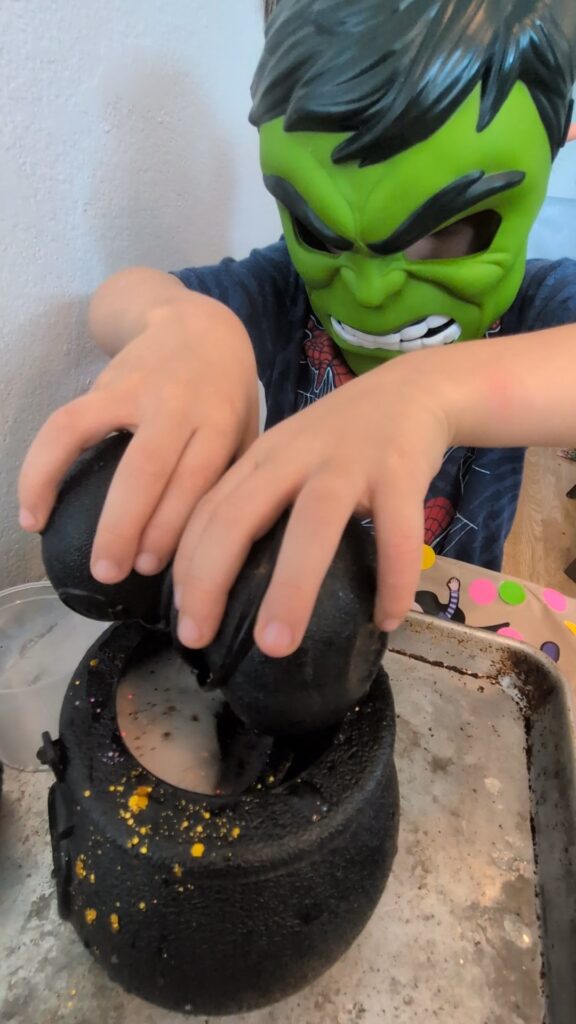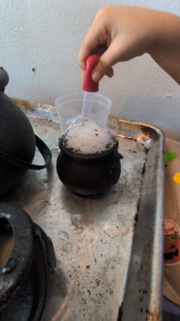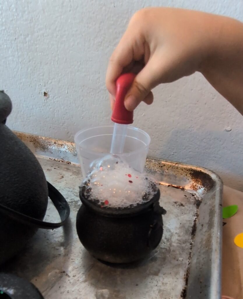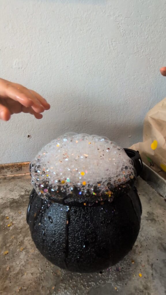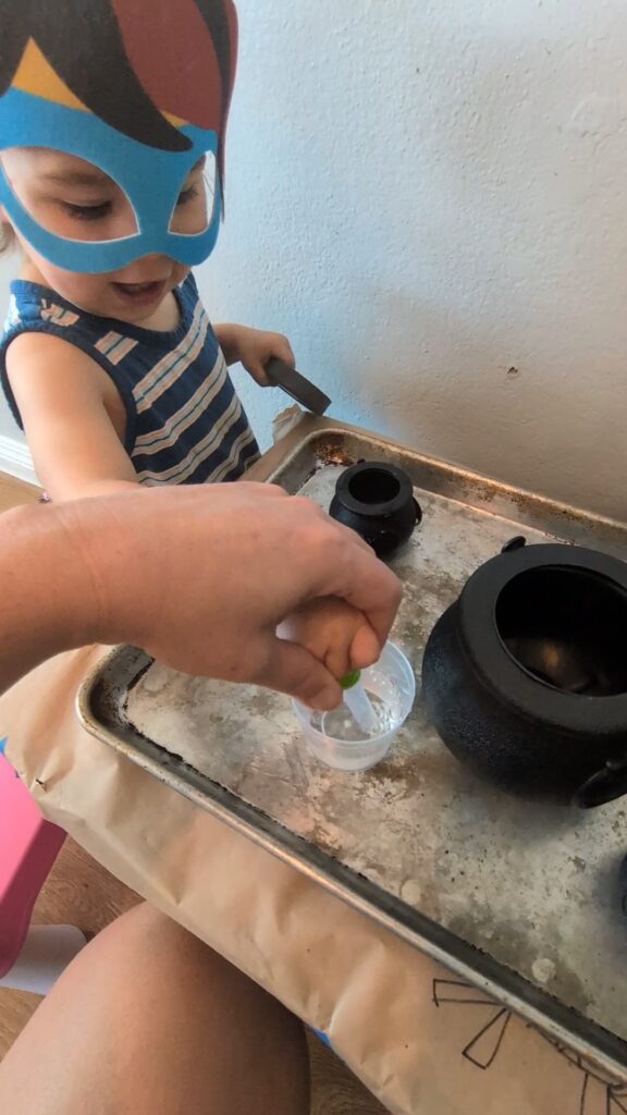 Witches Brew Potions is the perfect toddler activity to experience some Halloween magic. While you can just use supplies you have around the house, using black cauldrons and glitter adds to the Halloween fun.