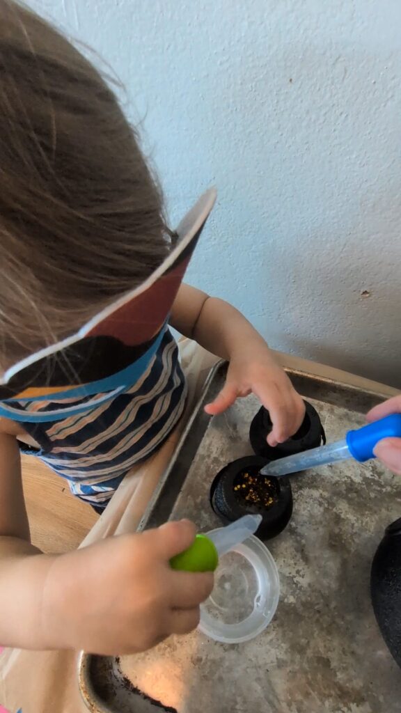 - 1-2 year olds: provide hand over hand help, especially in the beginning to help them learn how to squeeze the pipettes to get liquid from one container to another.