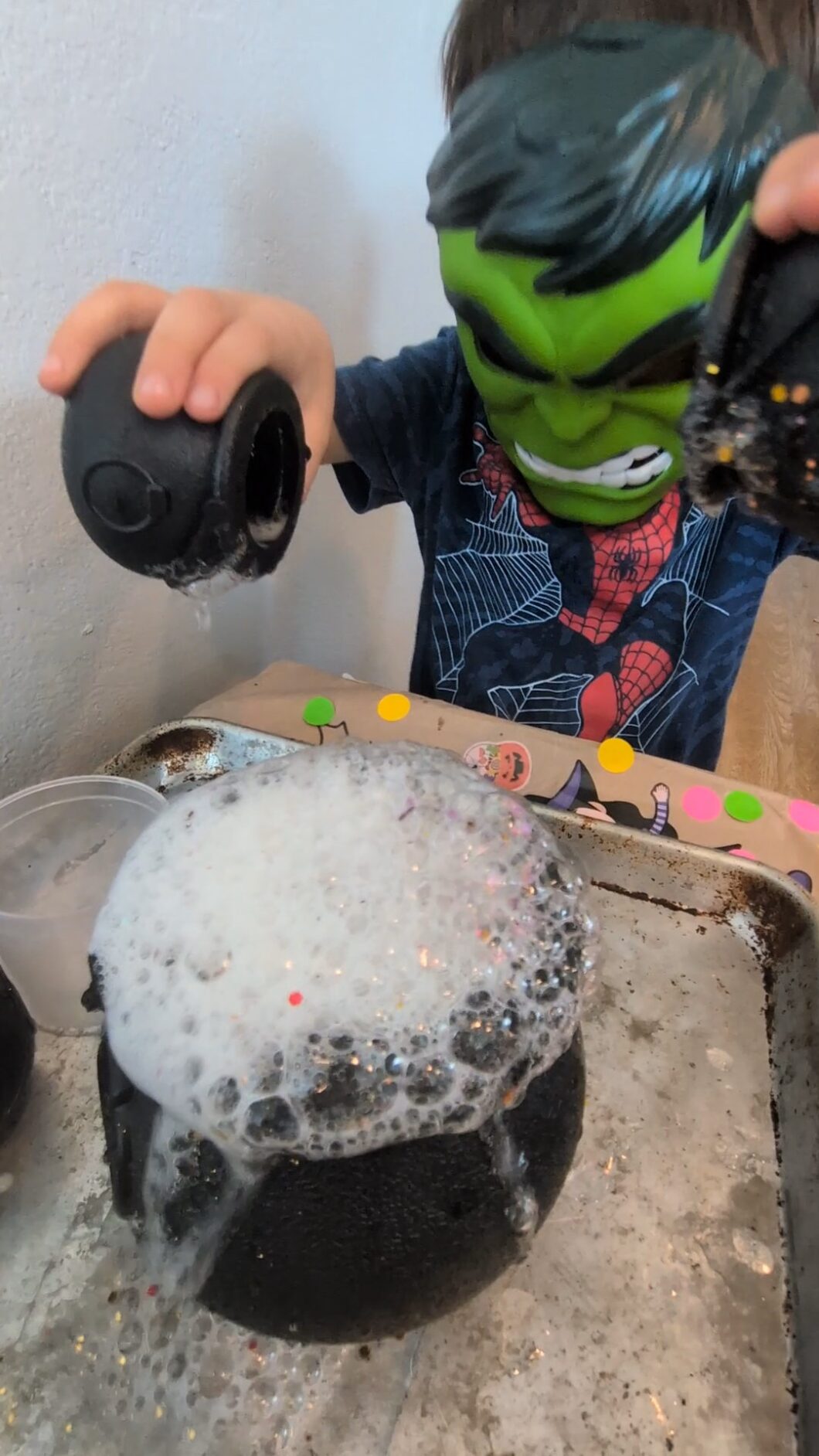 Witches Brew Potions is the perfect toddler activity to experience some Halloween magic. While you can just use supplies you have around the house, using black cauldrons and glitter adds to the Halloween fun.